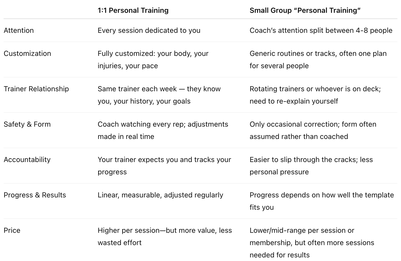 So if you’re asking, “Which is better for me: small group or personal training?”, the answer depends on what you need. For most people, especially those who are new, recovering from injury, intimidated, inconsistent, or just want something built for them, true 1:1 coaching beats anything else.